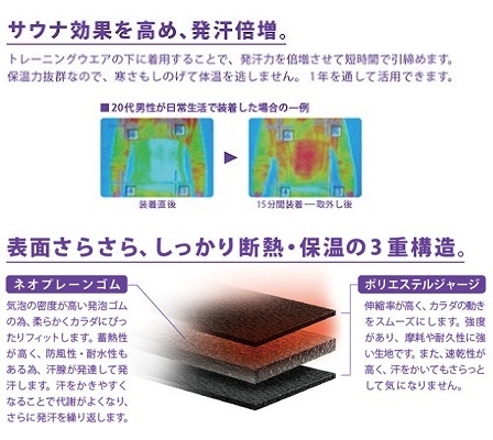 ●特殊発泡材により、蓄熱性、防風性、耐水性に優れ、汗腺が発達し発汗を繰り返します。