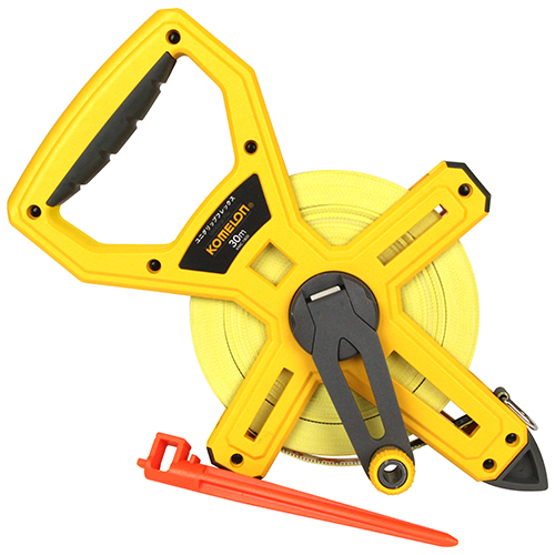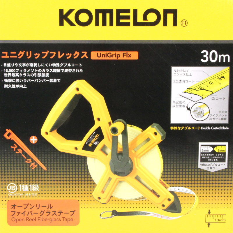 ●テープ幅:13mm。●テープ長さ:30m。●JIS1級。●ステーク付。●テープ仕様:磨耗に強いダブルコートガラス繊維性テープ。
