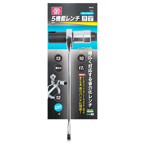 配管や電路支持・設備作業などに幅広く対応した多機能レンチです。4サイズのボルト・ナット、蝶ネジに対応したサイズ切替式両口ソケットとスパナを装備し、ソケットの送り角も5度、と取り回しも抜群で1本あれば設備工事で大変便利です。対辺17mmのソケット部分は二面幅は19.3mm前後しかないため、多機能レンチでは初めてレースウェイ、ハンガーレール内へ容易に入ることが可能です。装備する12mmスパナは抜き差ししなくてもクイック廻しが可能なスピードスパナを採用しており、スピーディーな作業が可能です。