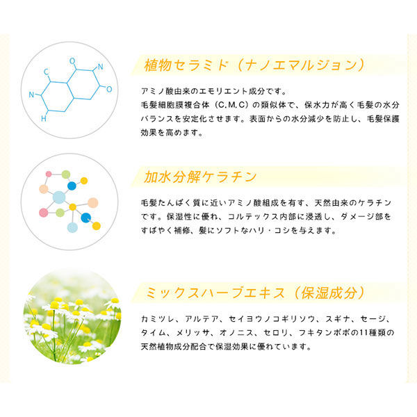 ●ナノ化した毛髪保護成分「植物セラミド」と「ケラチン」がダメージを受けた毛髪内外に潤いを与えます。