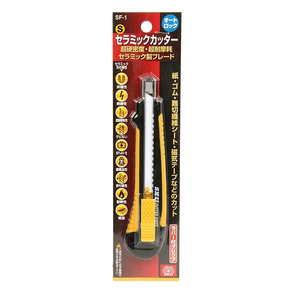 セラミックには、非磁性・絶縁性・超耐摩耗性・サビない・非アレルギー性・耐薬品性・非付着性・耐熱性・軽量などの特徴があります。すべりにくいラバー付グリップです。便利なオートロック式カッターナイフです。