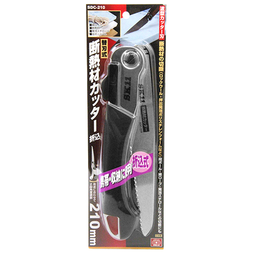 刃渡り:210mm。刃厚:0.8mm。適合替刃:SK11断熱材カッター替刃(SDCB-210)。