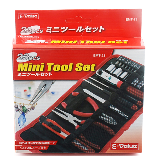 23点組。セット内容:カッター・ラジオペンチ135mm・ニッパ115mm・ピンセット・精密ドライバー(+No.00・-1.8)。セット内容:25mmビット(プラス(No.1・No.2・No.3)・マイナス(-5.5mm)・六角(2・2.5・3・4・5・6))。セット内容:2WAYラチェットドライバー・6.35mm差込角ソケット(6・7・8・10・12・13mm)・収納ポーチ。
