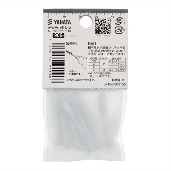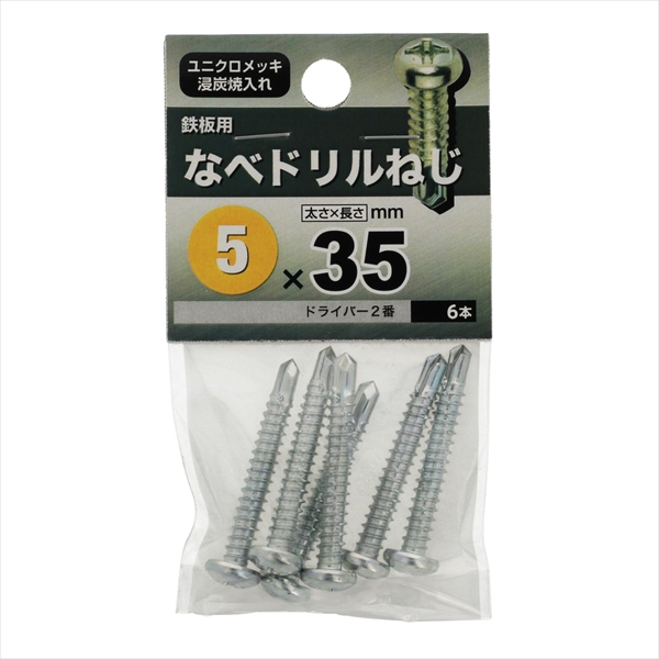 ●材質は鉄で三価クロメートめっき。十字穴付きのなべ頭タッピンねじで先端が切り刃になっています。この切り刃で鉄板に下穴をあけ、連絡してタップ立て、締付けまでがドリルねじ一本で出来ます。規格はJIS B 1125 をご覧ください。