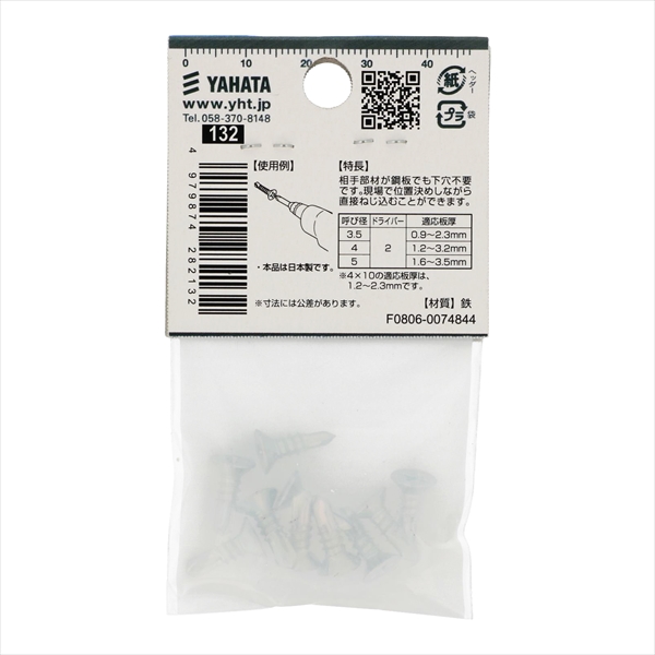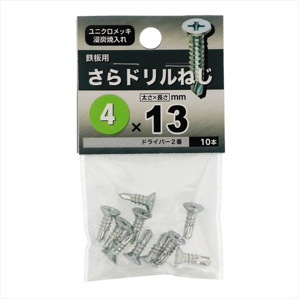●材質は鉄で三価クロメートめっき。十字穴付きの皿頭タッピンねじで先端が切り刃になっています。この切り刃で鉄板に下穴をあけ、連絡してタップ立て、締付けまでがドリルねじ一本で出来ます。頭部は出ませんが部材に座ぐり加工が必要です。規格はJIS B 1125 をご覧ください。