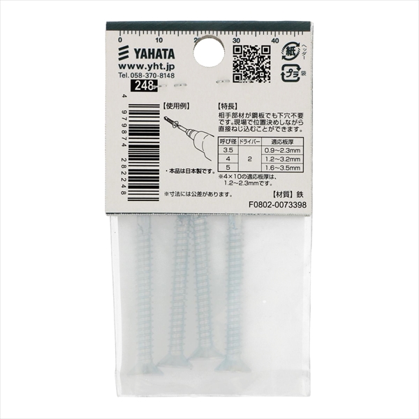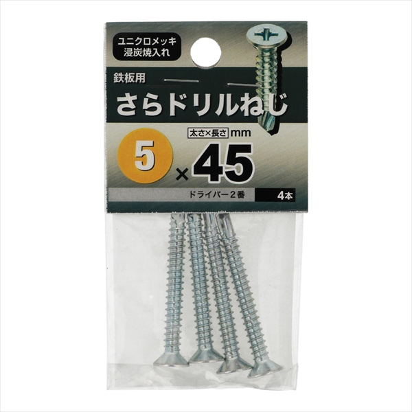 ●材質は鉄で三価クロメートめっき。十字穴付きの皿頭タッピンねじで先端が切り刃になっています。この切り刃で鉄板に下穴をあけ、連絡してタップ立て、締付けまでがドリルねじ一本で出来ます。頭部は出ませんが部材に座ぐり加工が必要です。規格はJIS B 1125 をご覧ください。