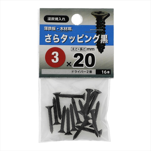 ●十字穴付きの皿頭タッピンねじです。相手部材には規定の下穴と頭部を出さない為の座ぐり加工が必要です。材質は鉄で耐食性向上のため黒色亜鉛クロメートがしてあります。規格はJIS B 1122附属書をご覧ください。