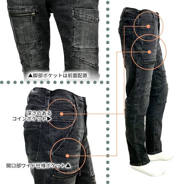 ●脚部ポケットは、ハーネス着用時に干渉しづらい前面配置。