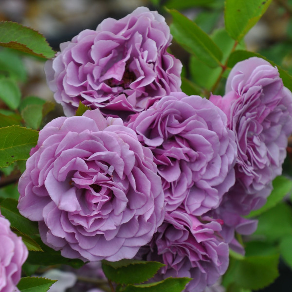 ●赤みがかった藤色、波状弁咲き、小中輪房咲きの花。