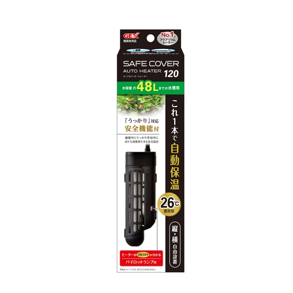 ●難燃性樹脂を使用したヒーターカバーがついているので、人にも、魚にも安全(横設置もOK)。