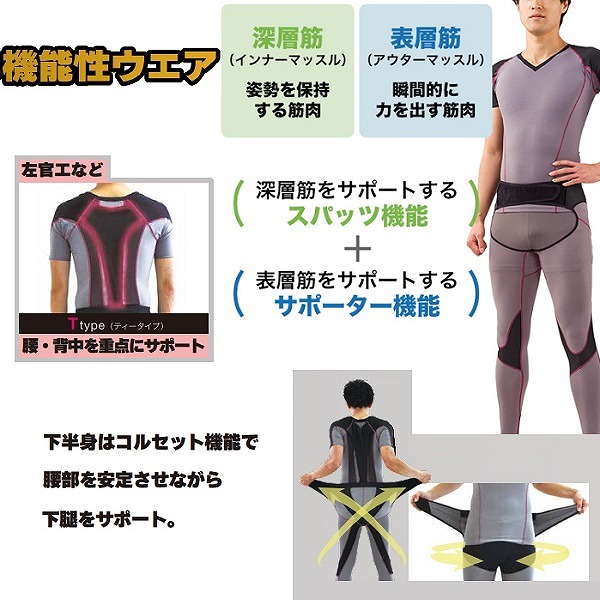 ●適度な着圧で深層筋(インナーマッスル)をサポートするスパッツ機能に表層筋(アウターマッスル)をサポートするサポーター機能の組み合わせで身体の内側と外側からサポート。