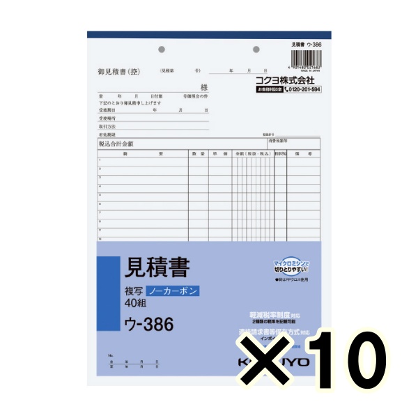 • (ケース販売)コクヨ ノーカーボン複写簿 見積書 ウ-386 A4タテ型 22行 40組 10冊