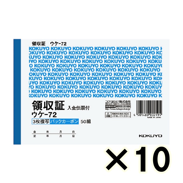 • (ケース販売)コクヨ バックカーボン複写 領収証(入金伝票付き) ウケ-72 3枚複写 A6ヨコ型 ヨコ書 50組 10冊