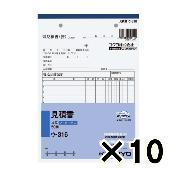 • (ケース販売)コクヨ ノーカーボン複写簿 見積書 ウ-316 A5タテ型 11行 50組 10冊