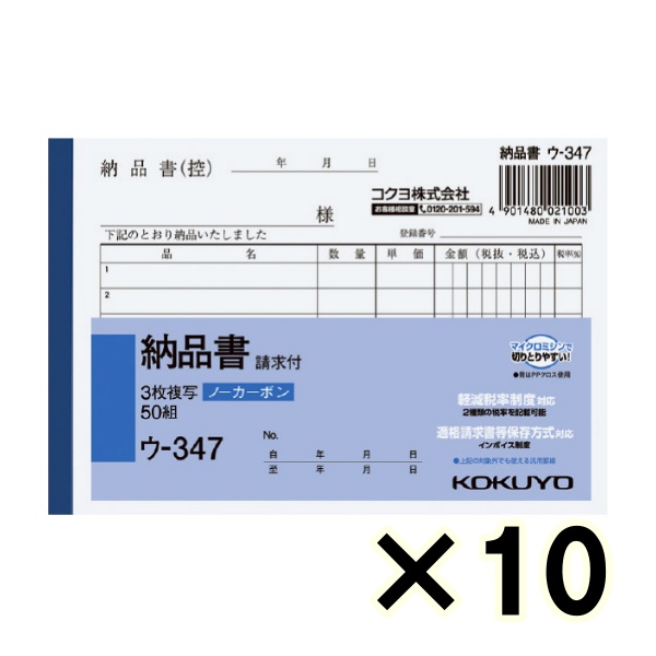 • (ケース販売)コクヨ ノーカーボン複写簿 3枚複写 納品書(請求付き) ウ-347 A6ヨコ型 6行 50組 10冊