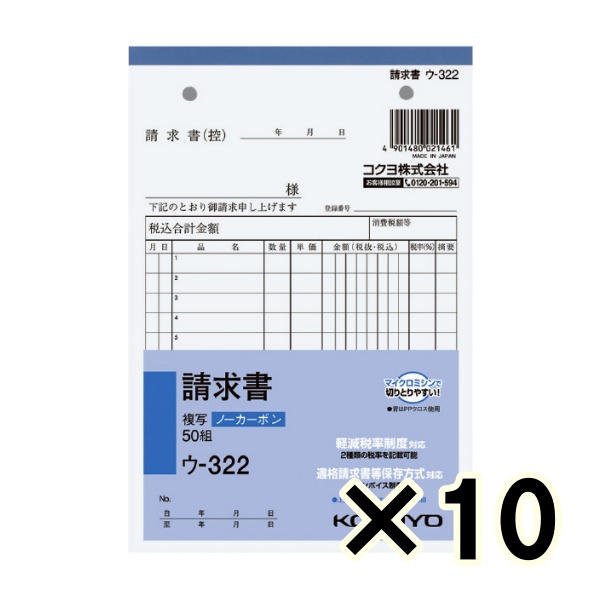 • (ケース販売)コクヨ ノーカーボン複写簿 請求書 ウ-322 B6タテ型 12行 50組 10冊