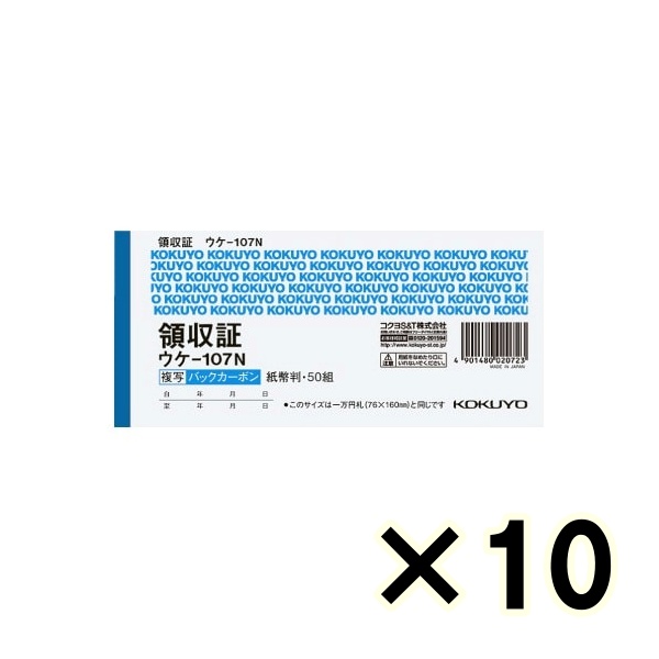 • (ケース販売)コクヨ バックカーボン複写 領収証 ウケ-107N 紙幣判ヨコ型 ヨコ書 50組 10冊