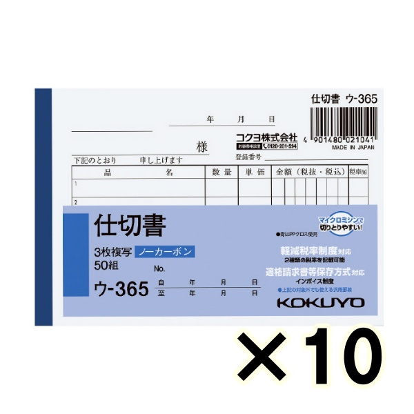 • (ケース販売)コクヨ ノーカーボン複写簿 3枚複写 仕切書 ウ-365 B7ヨコ型 5行 50組 10冊