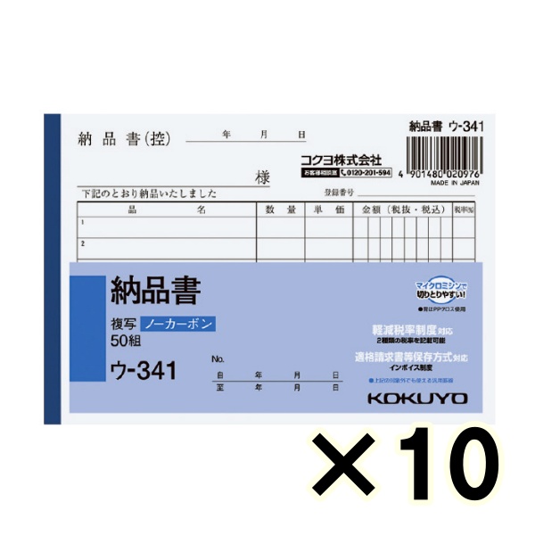 • (ケース販売)コクヨ ノーカーボン複写簿 納品書 ウ-341 A6ヨコ型 6行 50組 10冊
