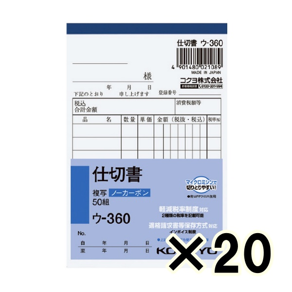 • (ケース販売)コクヨ ノーカーボン複写簿 仕切書 ウ-360 B7タテ型 8行 50組 20冊