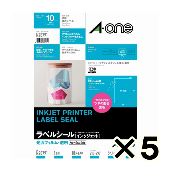 • (ケース販売)エーワン ラベルシール インクジェット 光沢フィルム 透明 A4サイズ 1面 ノーカット 10シート 28791 5個