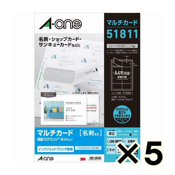 • (ケース販売)エーワン マルチカード インクジェットプリンタ専用紙 両面クリアエッジタイプ 白無地 厚口 A4サイズ 10面 名刺サイズ 10シート 51811 5個