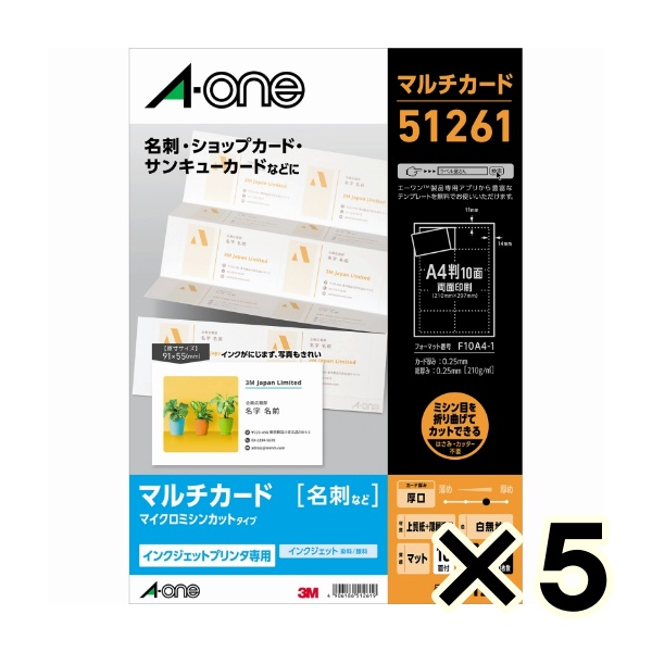 • (ケース販売)エーワン マルチカード インクジェットプリンタ専用紙 白無地 厚口タイプ A4サイズ 10面 名刺サイズ 10シート 51261 5個