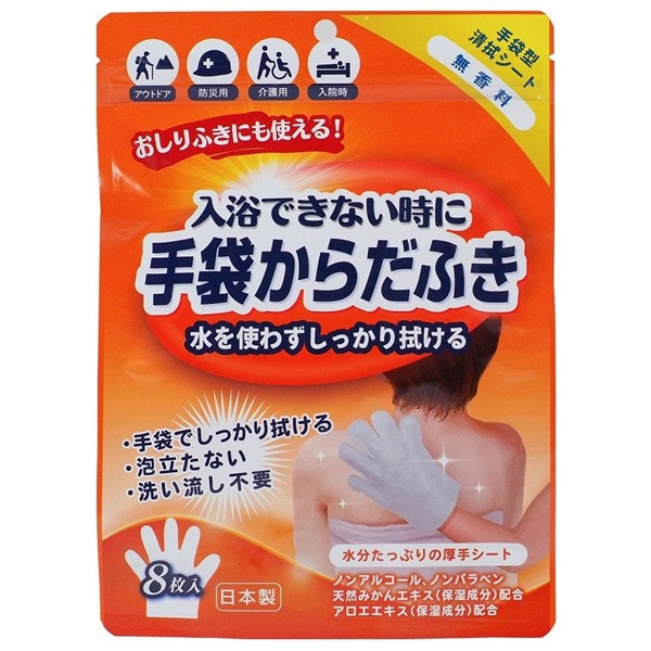 ●水いらずで拭くだけ簡単、手にはめるだけで素早く簡単に使うことができる手袋型ウェットシートです。