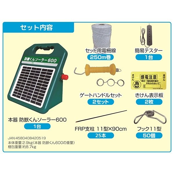 防獣くんソーラー600×1台、FRP支柱11型(90cm)×25本、セット用電柵線250m巻×1巻、フック11型×50個、簡易テスター×1台、ゲートハンドルセット×2セット、きけん表示板×2枚