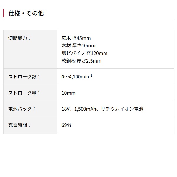 レシプロソーブレードNo.68(木材用)・レシプロソー刃用ブレードホルダー(六角穴付ボルト付/本体取付)・六角棒レンチ3mm(本体収納)・充電器・電池パック