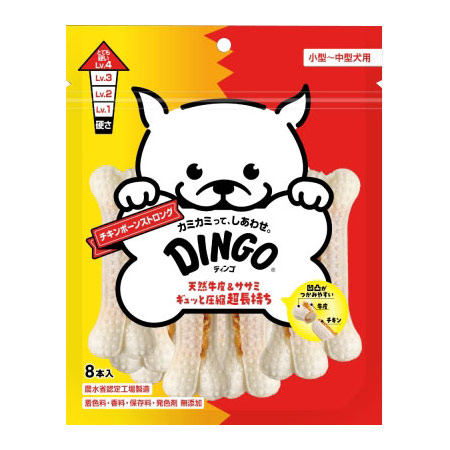 ●ササミを牛皮の中に入れ、ギュっと圧縮したプレスガム。表面の凸凹で滑りにくく持ちやすい。