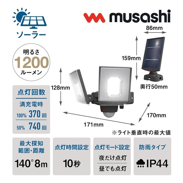 ●ライト部がスライド式で照射方向を自由に調節、真下や両端を照らすことも自由なソーラー式センサーライトです。