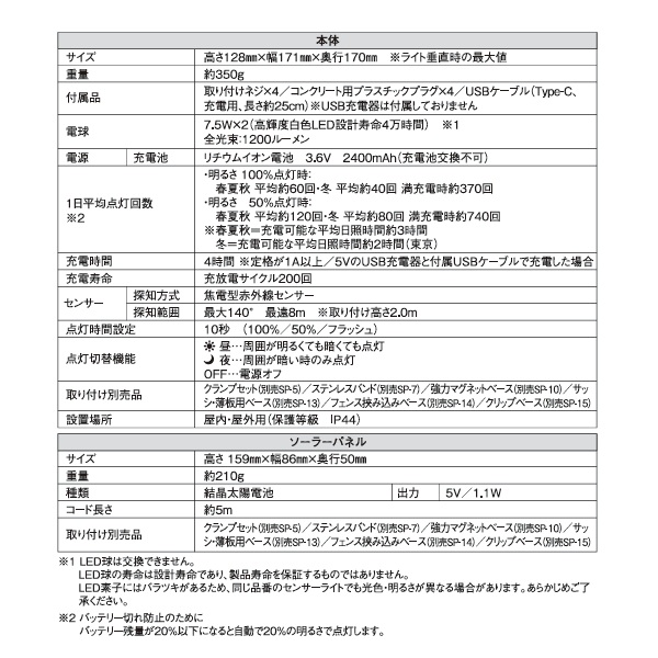 ●日照不足でソーラー発電が不足したときはUSBから充電OK、安定した点灯を維持できます。