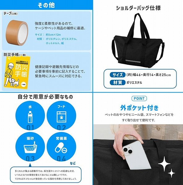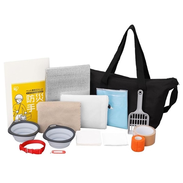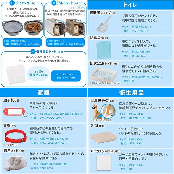 ショルダーバッグ・ディッシュ×2・アルミシート・おそうじシート(10枚入り)・折りたたみトイレ・猫砂用スコップ・防臭袋(20枚入り)・迷子札・首輪・猫ネット・自着性テープ・タオル・ハンカチ(ガーゼ素材)・テープ・防災手帳