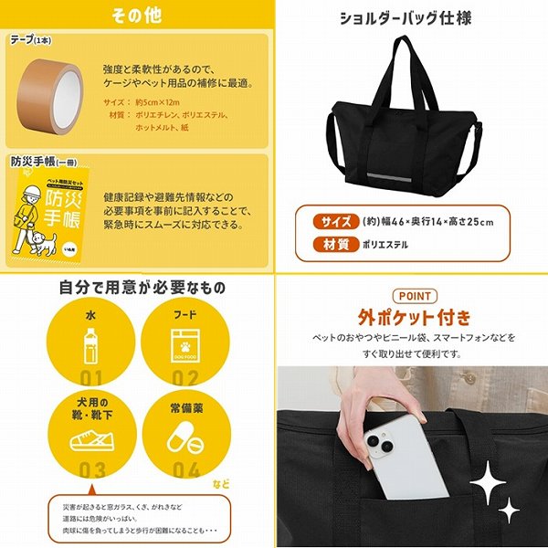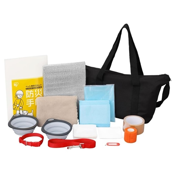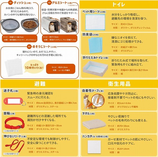 ・ショルダーバッグ・ディッシュ×2・アルミシート・おそうじシート(10枚入り)・折りたたみトイレ・ペットシーツ・防臭袋(20枚入り)・迷子札・首輪・リード・自着性テープ・タオル・ハンカチ(ガーゼ素材)・テープ・防災手帳