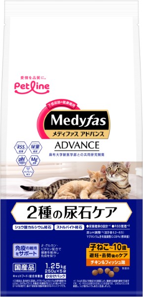 • (ケース販売)メディファスアドバンス 2種の尿石ケア 子ねこから10歳まで 避妊・去勢後のケア チキン&フィッシュ味 1.25kg(250g×5) 6個