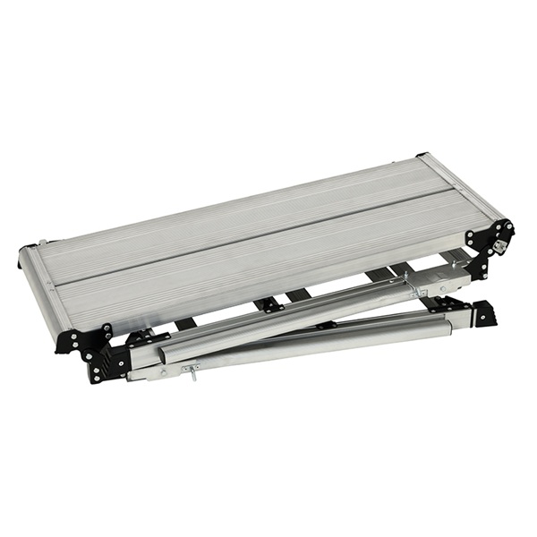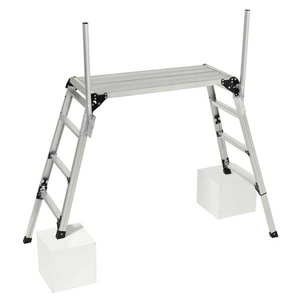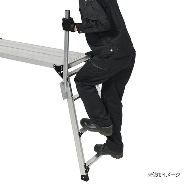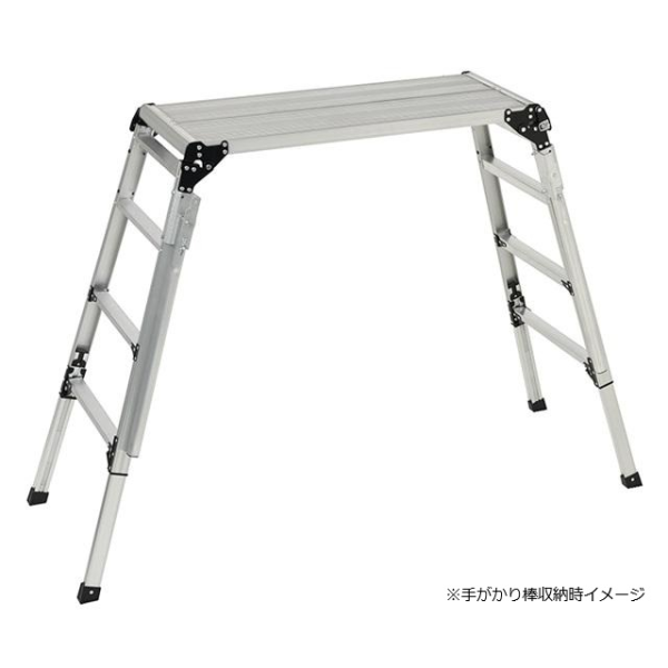 ●回転収納式手掛り棒が2本標準装備で天板への昇降をサポート、さらに脚伸縮可能な足場台です。